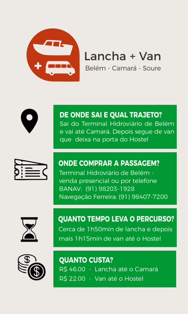 R$ 46.00 - Lancha até o Camará R$ 22.00 - Van até o Hostel