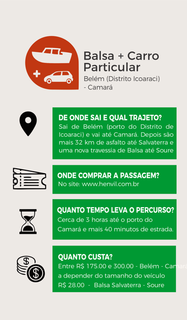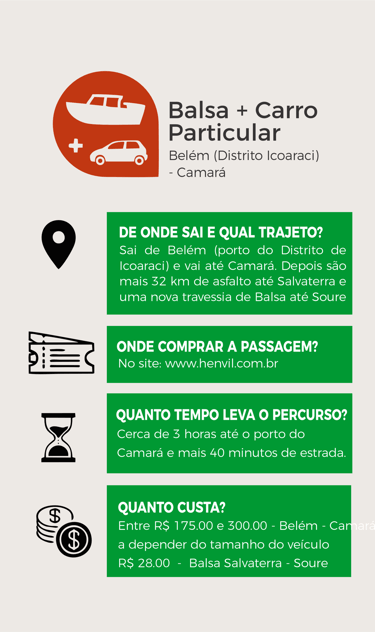 Sai de Belém (porto do Distrito de Icoaraci) e vai até Camará. Depois são mais 32 km de asfalto até Salvaterra e uma nova travessia de Balsa até Soure